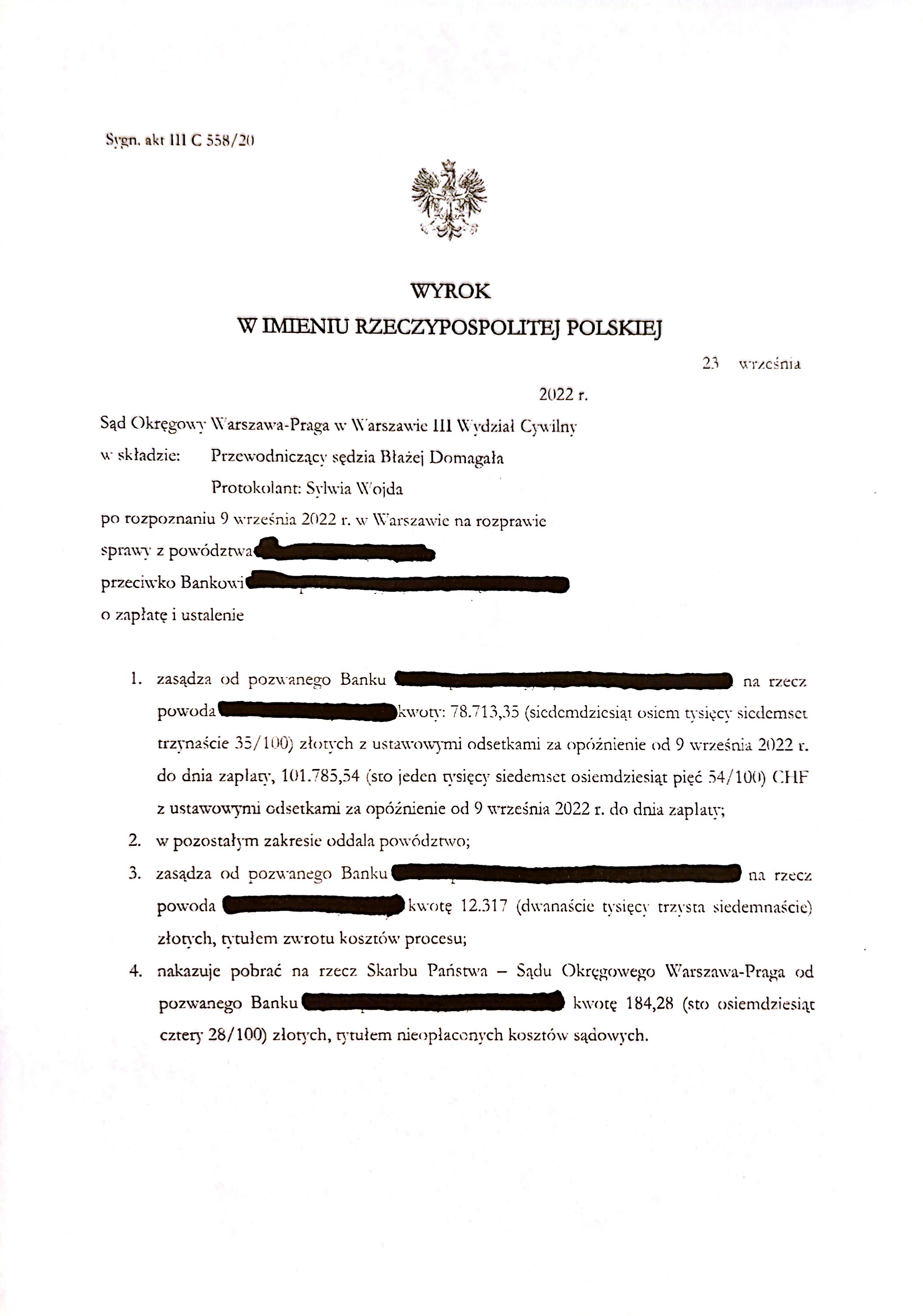 Z radością informuję o wygranej Klienta w sprawie przeciwko bankowi.